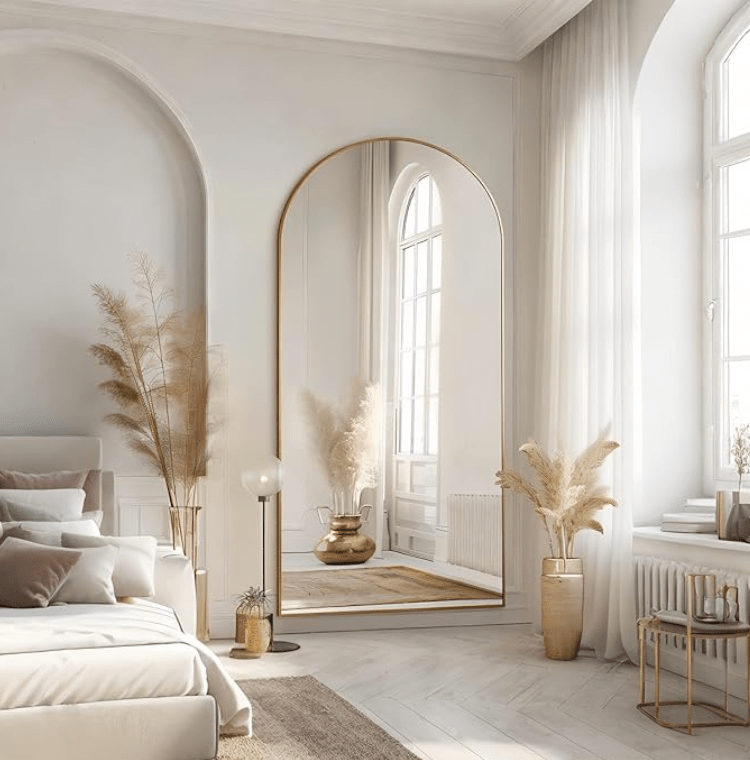 Leaning floor mirrors or oversized wall mirrors help visually expand the room while maintaining a calm aesthetic.