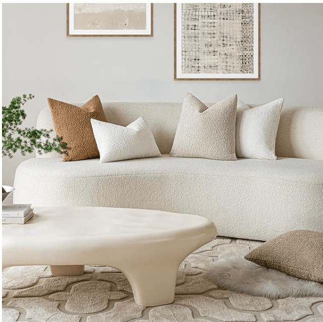 The mix of textures—smooth, nubby, fluffy—creates that lived-in, cozy feel.