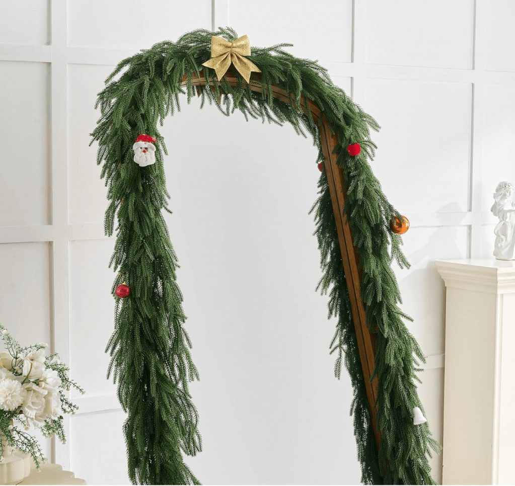 - Real or faux evergreen garlands on mantles, shelves, or stair rails