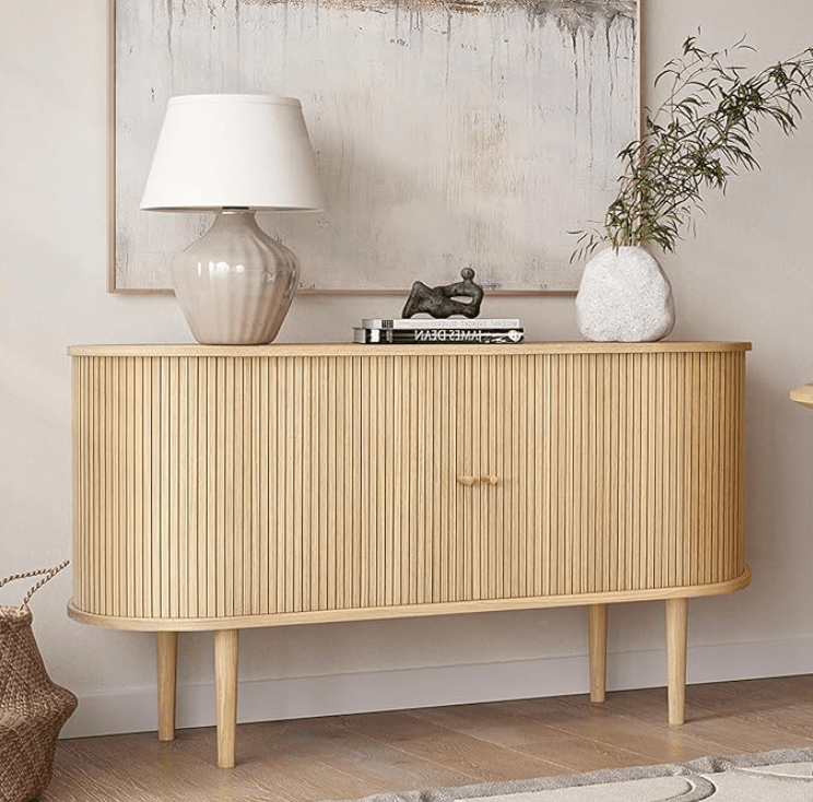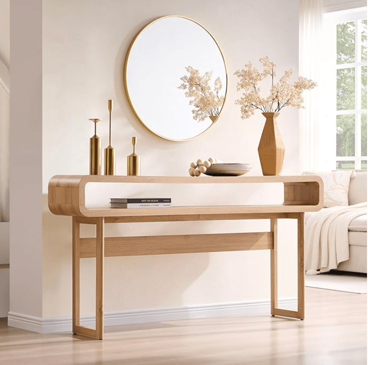 Modern-boho design works best when the foundation is simple. Choose an entryway table with: