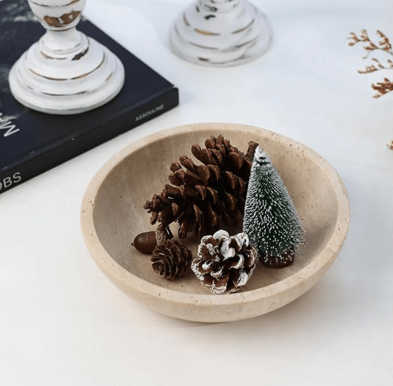 - Neutral or earth-toned holiday figurines (think ceramic trees, wooden stars, or clay bells)