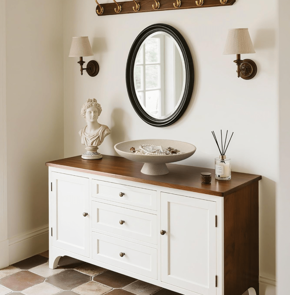 For perfectly balanced decor, group items in visual “triangles.” This technique makes your entryway look intentional and designer-approved.