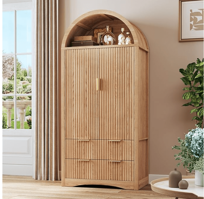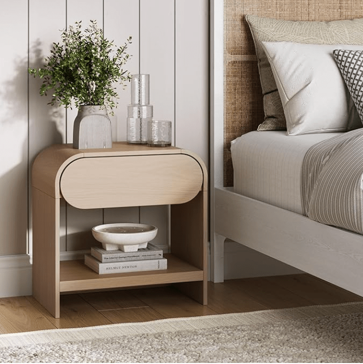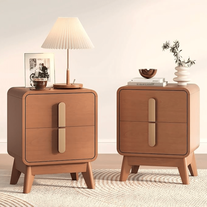 - Fluted or wood nightstands with drawers
