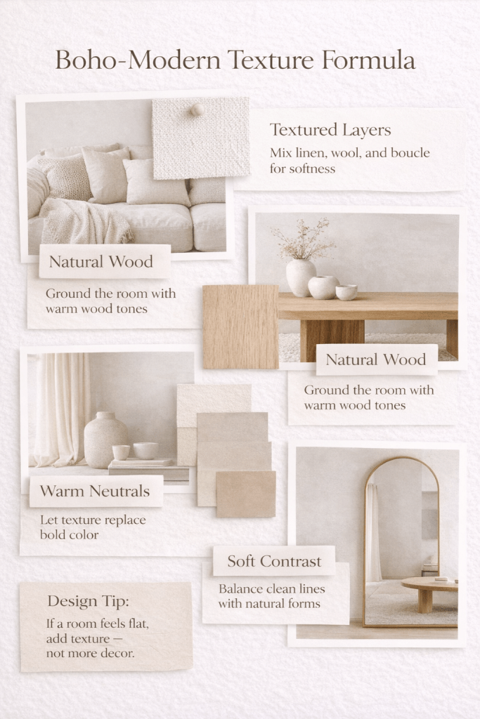 When a room feels calm, cohesive, and visually interesting without being cluttered, texture is usually doing the work. In boho modern interiors, the most successful spaces often follow a simple rule: one room, three textures. This approach creates depth while keeping the design clean, intentional, and timeless.